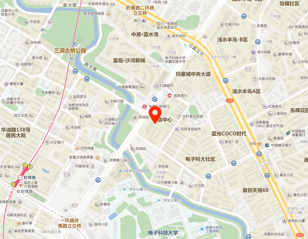 周边信息 酒店 隐栖堂酒店(成都建设路电子科大店)、成都协信中心希尔顿酒店、蒲公英酒店(电子科大店)、花筑凌云阁酒店、尚锦品酒店(成都春熙路电子科大店)、轻住联盟·威尔汀酒店、良晨酒店(泰安街前锋路店)、云泽酒店(成都电子科大店)、成都庐孚酒店(前锋路电子科大春熙路店)、喆啡酒店(成都春熙前锋路地铁站店)。 餐饮 协信中心希尔顿酒店-青雅中餐厅、DF艺术餐厅·宴会厅(财富又一城店)、DF艺术餐厅、巴国龙鼎老火锅(华油路总店)、尛小二老火锅(协信中心店)、飞火令·西昌火盆自助烤肉(协信店)、黄潇洒老火锅、蒙古营地烤乳猪·烤羊腿·烤全羊(建设路店)、汇茗苑(府青东街店)、九倒拐串串香。 银行 中国建设银行(成都电子科大东院支行)、天津银行(成华支行)、中国工商银行(成都八里庄支行)、中国邮政储蓄银行(府青路邮局营业部)、华夏银行(成都成华支行)、交通银行、成都市农村商业银行(府青路分理处)、兴业银行(成都前锋街社区支行)、徽商银行(成都浅水半岛社区支行)。 超市 家慧超市(府青惠园店) 学校 成都恒益实用技术职业培训学校 医院 成都市成华泰兴医院 部分入驻企业 成都微型气候咖啡有限公司、成都和裕电子商务有限公司、成都博比翠进出口贸易有限公司、四川中星视显科技有限公司、四川大地山河环保工程公司、一诺财税、恒鼎科技(四川分公司)、成都立信博业企业管理咨询有限公司、四川鑫昱安科技有限公司、成都兴得嘉贸易有限公司......